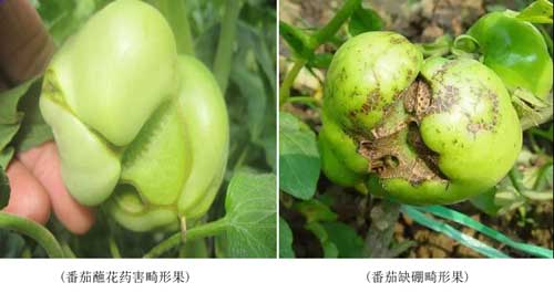 药害造成的畸形果表现为果实表皮停止生长,使果形不正常或果实不膨大。果表凹凸不平,品质变劣,影响食用价值。